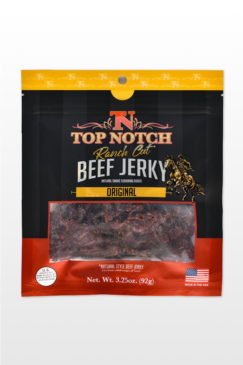 Our Original beef jerky is a classic favorite. With a smoky, slightly sweet flavor and a soft, tender texture, original beef jerky is sure to be loved by everyone! Original beef jerky is the perfect snack for someone who likes it classic and delicious. All Top Notch Premium beef jerky is made with 100% locally-raised beef to provide you with the best quality beef jerky possible. Our ranch cut premium beef jerky is cut from solid strips of our marbled beef, and turned into jerky with a perfect savory flavor and a soft, meaty texture. Try our premium beef jerky today!