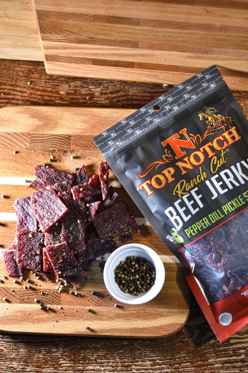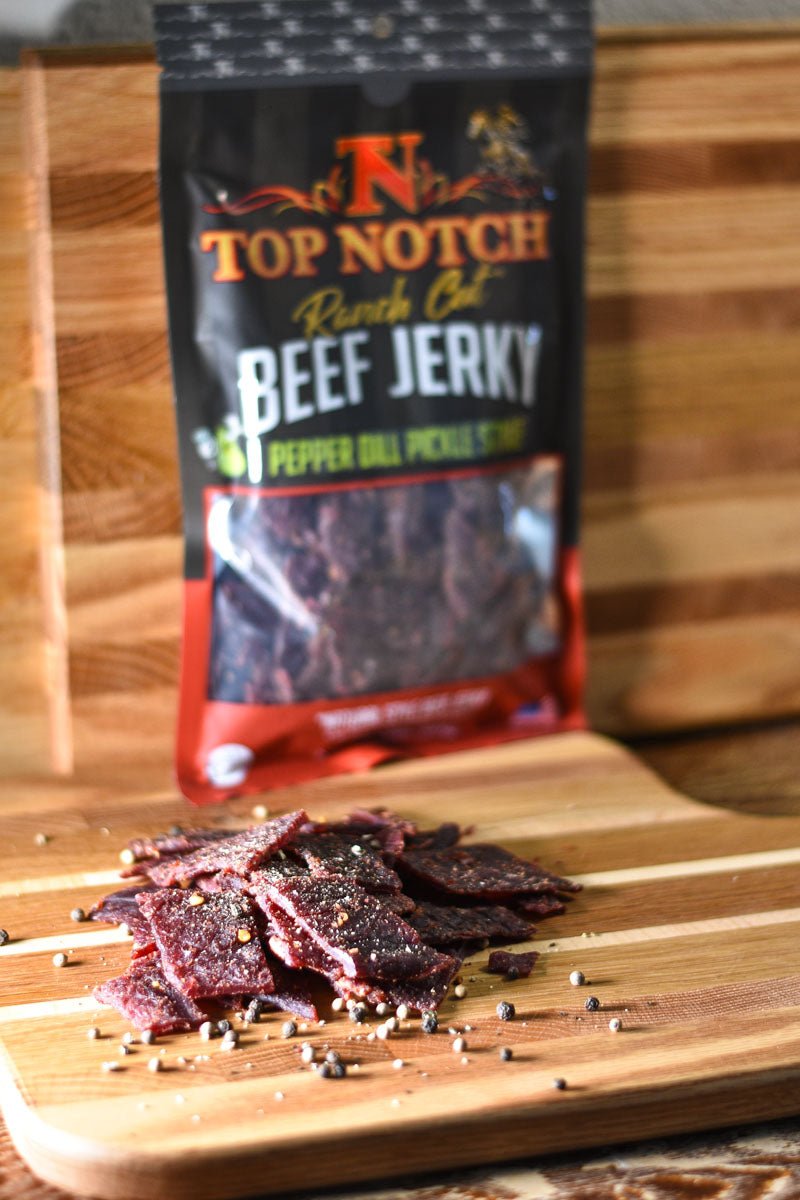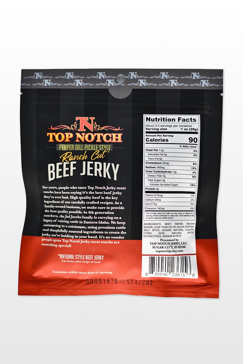 Top Notch Premium Beef Jerky is made from strips of beef that are dried and flavored to make a chewy, dried strip of meat that makes for a delicious snack. Pepper Dill Pickle beef jerky is strips of dried meat that are salted and seasoned with dill pickle spices and flavorings and pepper! Ranch cut beef jerky is natural cut beef jerky, meaning each piece of Pepper Dill Pickle beef jerky is made with beef cut straight from solid strips of beef.